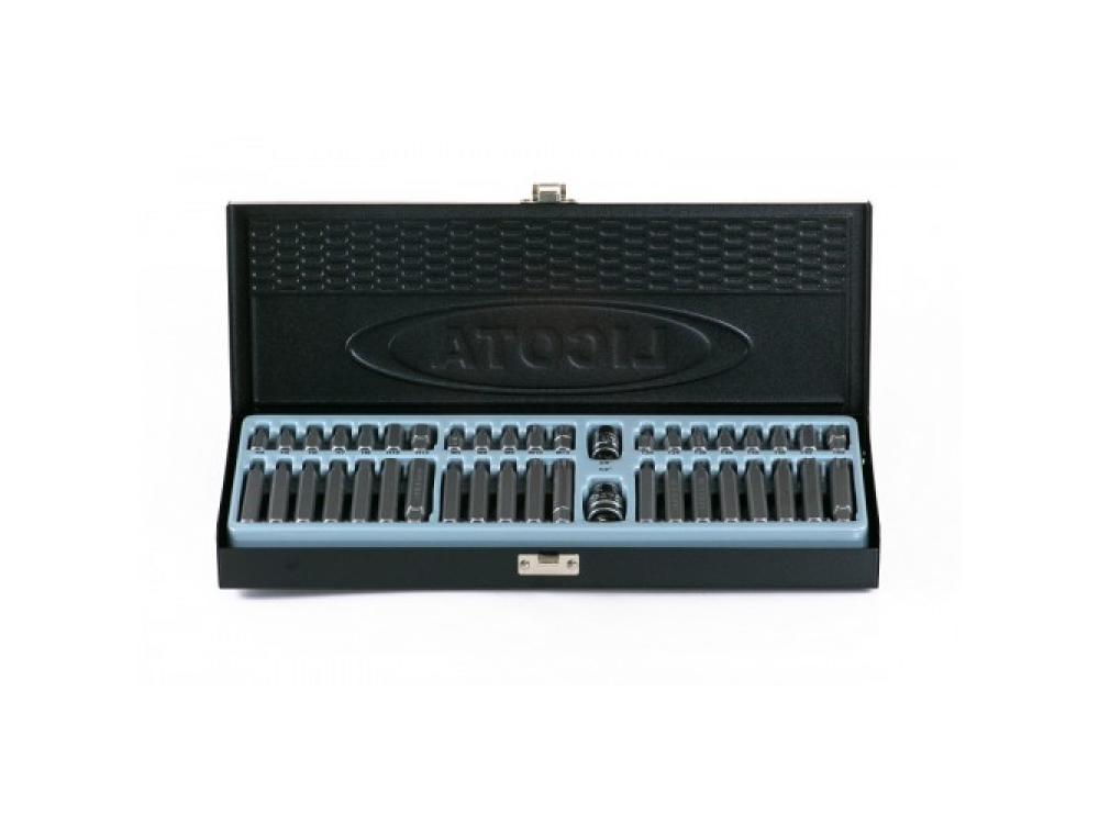Размер привода: 10 мм HEX;Биты 30 мм HEX (7 шт): Н4, Н5, Н6, Н7, Н8, Н10, Н12;Биты 75 мм HEX (7 шт): Н4, Н5, Н6, Н7, Н8, Н10, Н12;Биты 30 мм Torx (8 шт): Т20, Т25, Т30, Т40, Т45, Т50, Т55, T60;Биты 75 мм Torx (8 шт): Т20, Т25, Т30, Т40, Т45, Т50, Т55, T60;Биты 30 мм Spline (5 шт): М5, М6, М8, М10, М12;Биты 75 мм Spline (5 шт): М5, М6, М8, М10, М12;Адаптер 3/8” под биты;Адаптер 1/2” под биты