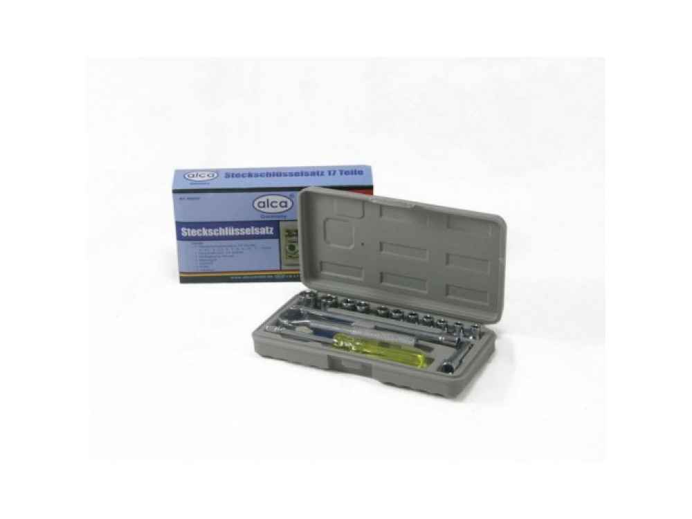 Набор головок 17 предметов. 11 головок, 2 удлинителя, 1 трещётка, 1 насадка кардан, штифт для обточки. Жесткий пластиковый ящик.