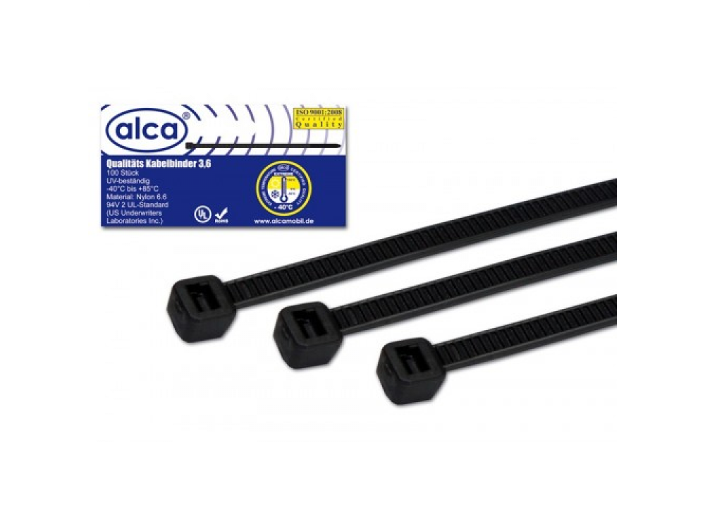 Хомут—стяжка кабельная пластиковая W3.6 L370, цвет черный, 100 шт. в упаковке, температура эксплуатации от — 40 до + 85, материал нейлон, устойчивость к окислению и травлению.