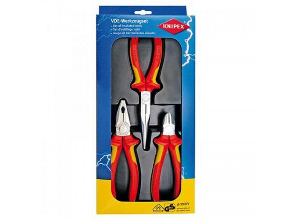 Набор клещей Knipex KN-002012 состоит из трех предметов расположенных в пластиковом блоке. Инструмент предназначен для выполнения таких задач, как захват и удержание деталей, резка и сгибание проволоки различной степени жесткости. Рукоятки оснащены диэлектрическими чехлами, что позволяет безопасно работать на электрооборудовании под напряжением до 1000 В переменного и 1500 В постоянного тока.