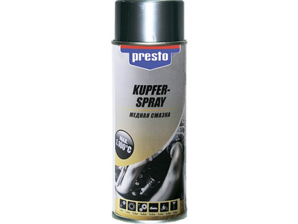 PRESTO Смазка медная устойчива к воде, слабым кислотам, солям, щелочам, предотвращает коррозию. Сохраняет длительный смазочный эффект даже при экстремальных температурных колебаниях (от -40°С до +1100°С). Идеальна для обработки резьбы свечей зажигания, направляющих тормозных колодок, болтов, соединений газовыхлопного тракта и других деталей, работающих при повышенных температурах.