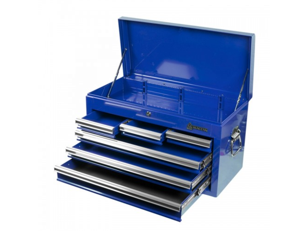Ящик инструментальный, 6 полок, синий 511-06570B служит для организации рабочего места в любом производственном помещении, на станциях технического обслуживания или авторемонтных мастерских, хранение инструмента, мобильность. Особенности: - 6 выдвижных полок; - Центральный замок; - Переносной стальной лоток. Технические характеристики: - Размеры верхнего отсека: 640х290х115 мм - Размеры выдвижных полок: 3 - 170х270х40 мм 2 - 570х270х40 мм 1 - 570х270х65 мм - Материал: сталь - Цвет: синий - Габариты: 658 х 308 х 370 мм - Вес: 22,8 кг