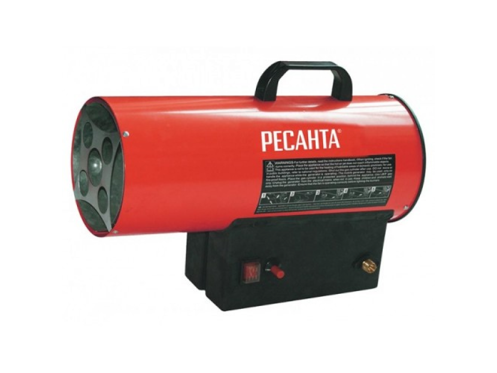 Газовая тепловая пушка РЕСАНТА ТГП-10000 – воздухонагреватель, работающий на сжиженном газовом топливе. Топливо необходимо для получения горячей атмосферы в камере сгорания, а электроэнергия, подводимая к устройству, необходима для питания вентилятора, нагнетающего воздух, и для функционирования автоматики. Газовые пушки прямого нагрева являются простой и надёжной конструкцией без дымохода, где горячий воздух из устройства поступают в помещение.
